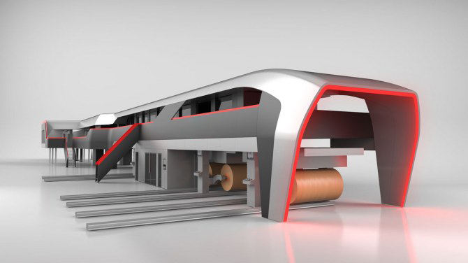 The style of the enclosure aims to transmit a sense of continuity despite the fragmented layout typical of this type of industrial system. Corrugators, glueing machines, hotplates, cutter and operator workstations are incorporated into a single line by using calendered aesthetic elements and bands of colour which flow in an orderly manner from the start to the end of the machine.