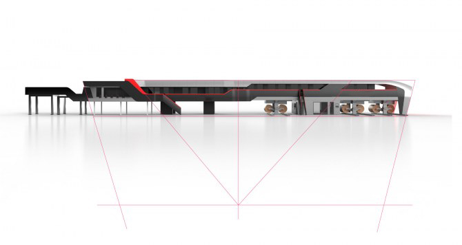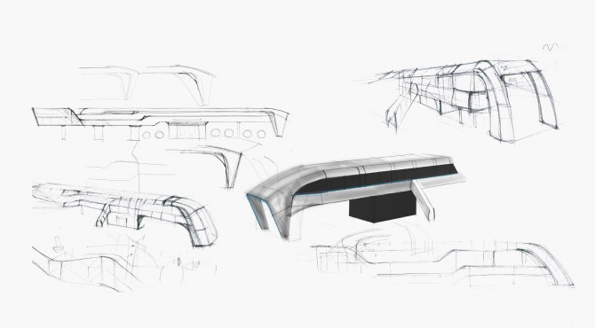 The shape of the elements is designed to draw the eye of the observer towards the signature features of the machine enclosure . The force lines converge in the middle and define the edges and details.